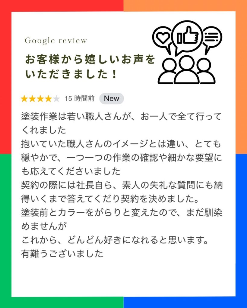 Googleクチコミにてお客様から嬉しいお声をいただきました。
